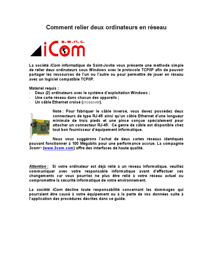 La manœuvre n'est vraiment pas compliquée mais il peut être bon de la mettre au clair. Un câble non inversé nécessite obligatoirement un module nommé « hub », ce qui est plus dispendieux et inutile si vous désirez connecter documents similar to comment relier deux ordinateurs en reseau.pdf. Cela peut vous permettre de partager des fichiers ou de jouer ensemble à des jeux vidéo ou encore d'imprimer sur une imprimante connectée sur un pc ou d'effectuer des sauvegardes croisées. Sur notre site tous les livres de pdf sont gratuits et téléchargeables. Si votre ordinateur est déjà relié à un réseau informatique, veuillez communiquer avec votre responsable informatique avant d'effectuer ces.